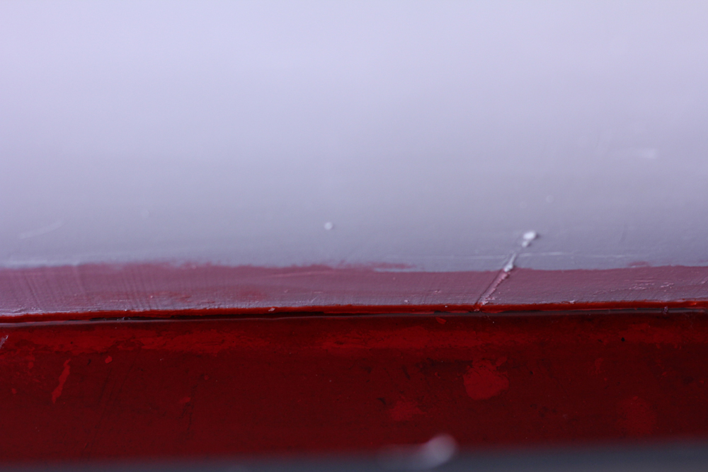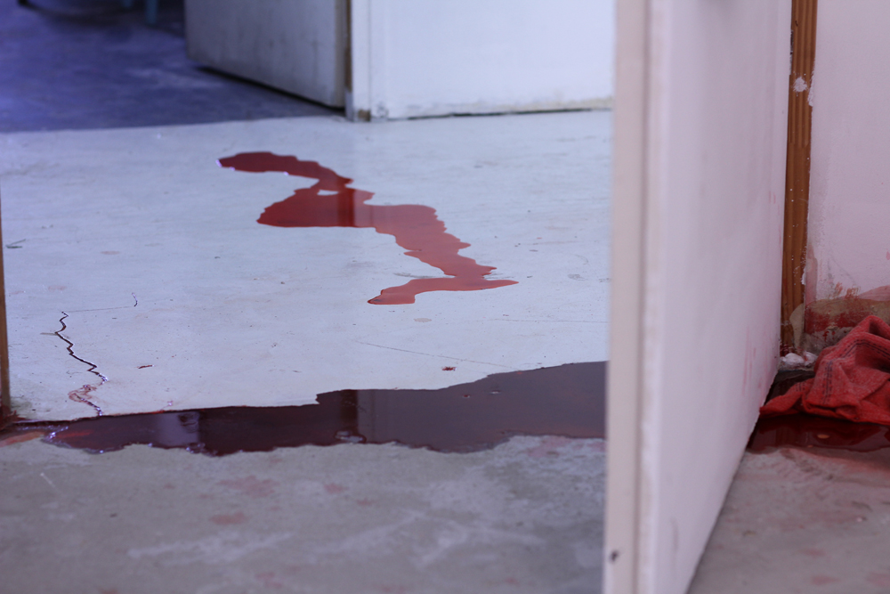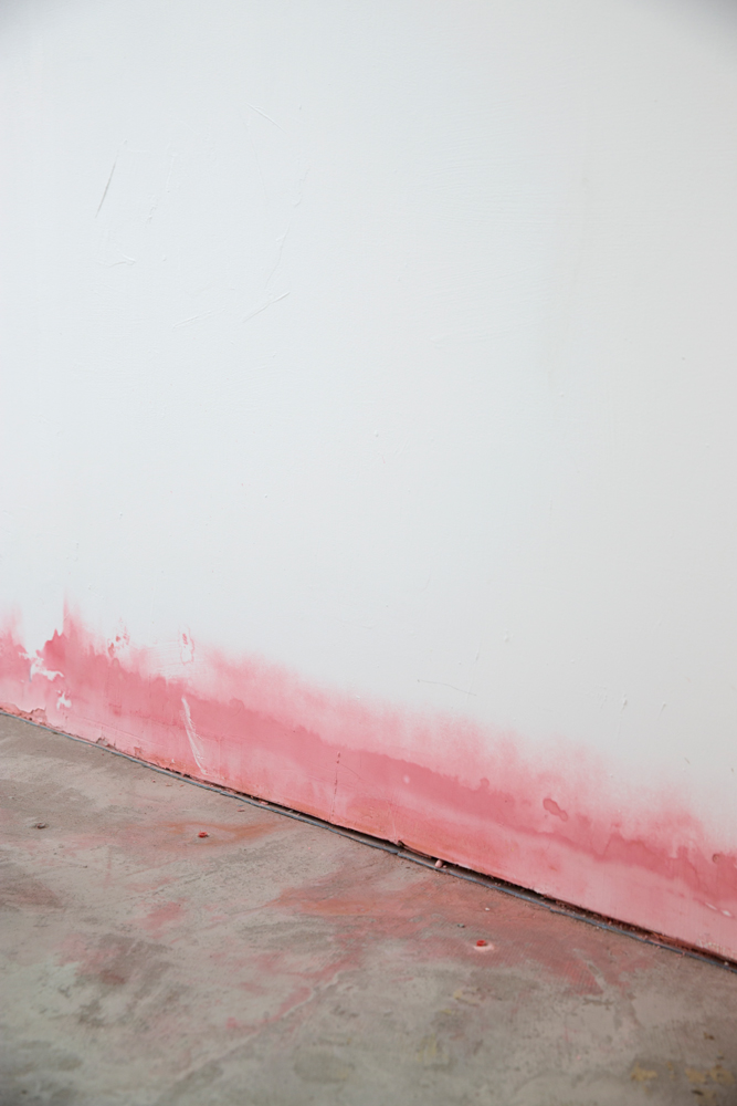 A flood of water with red pigment in a space built from plaster walls. A blushing moist waterline is what remained as a trace.